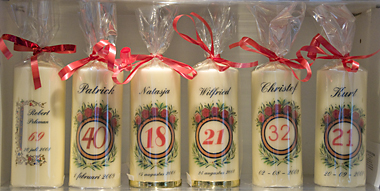 Beste, Verjaardagen zijn een vaste gelegenheid om familie en vrienden een attentie te geven. Waarom niet eens een kaars, als symbool van licht in de duisternis, van vriendschap, genegenheid en liefde ? In ons liturgisch centrum hebben we kaarsen, die we speciaal voor deze gelegenheid kunnen personaliseren met leeftijd, naam, ea. . Kom gerust vrijblijvend kijken naar de diverse uitvoeringen. Je zal verwonderd zijn over al wat we je te bieden hebben. Tot binnenkort. Al deze kaarsen, die hieronder afgebeeld zijn, zijn verkrijgbaar bij : Liturgisch Centrum - Abdij Dendermonde Dijkstraat 32-34, 9200 Dendermonde, Tel. 052 33 87 86, info@abdijdendermonde.be |