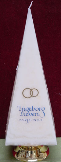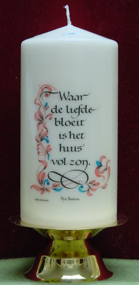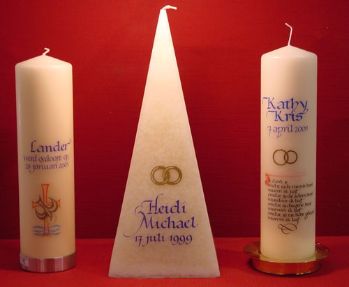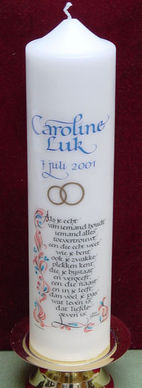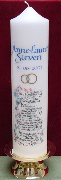 Prachtige kaarsen voor doopsel/huwelijk/jubileummet aangepaste calligrafische teksten naar keuze.