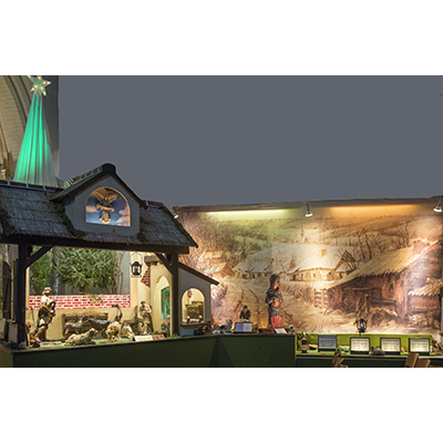 Tegen Kerstmis wordt de herdersstal een volledige kerststal met de heilige Familie, engelen en herders en koningen. Op die dag wordt de herdersstal de kerststal, die het mysterie van Gods’ menswording zichtbaar maakt.Dit jaar is de achtergrond van de herdersstal een panorama op doek van 8,5 meter lang op 3 meter hoog, met Kempense hoeves en Bruegeland-schappen. Het prachtige beeld van Johannes de Doper wijst de weg naar de stal. (Zie afbeelding.)